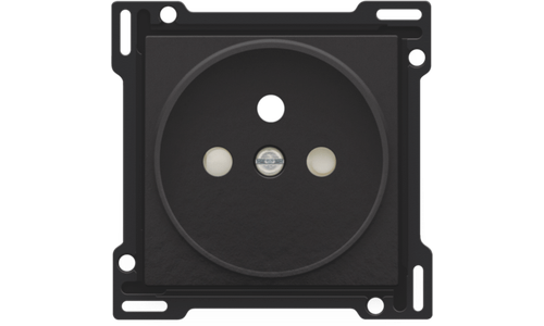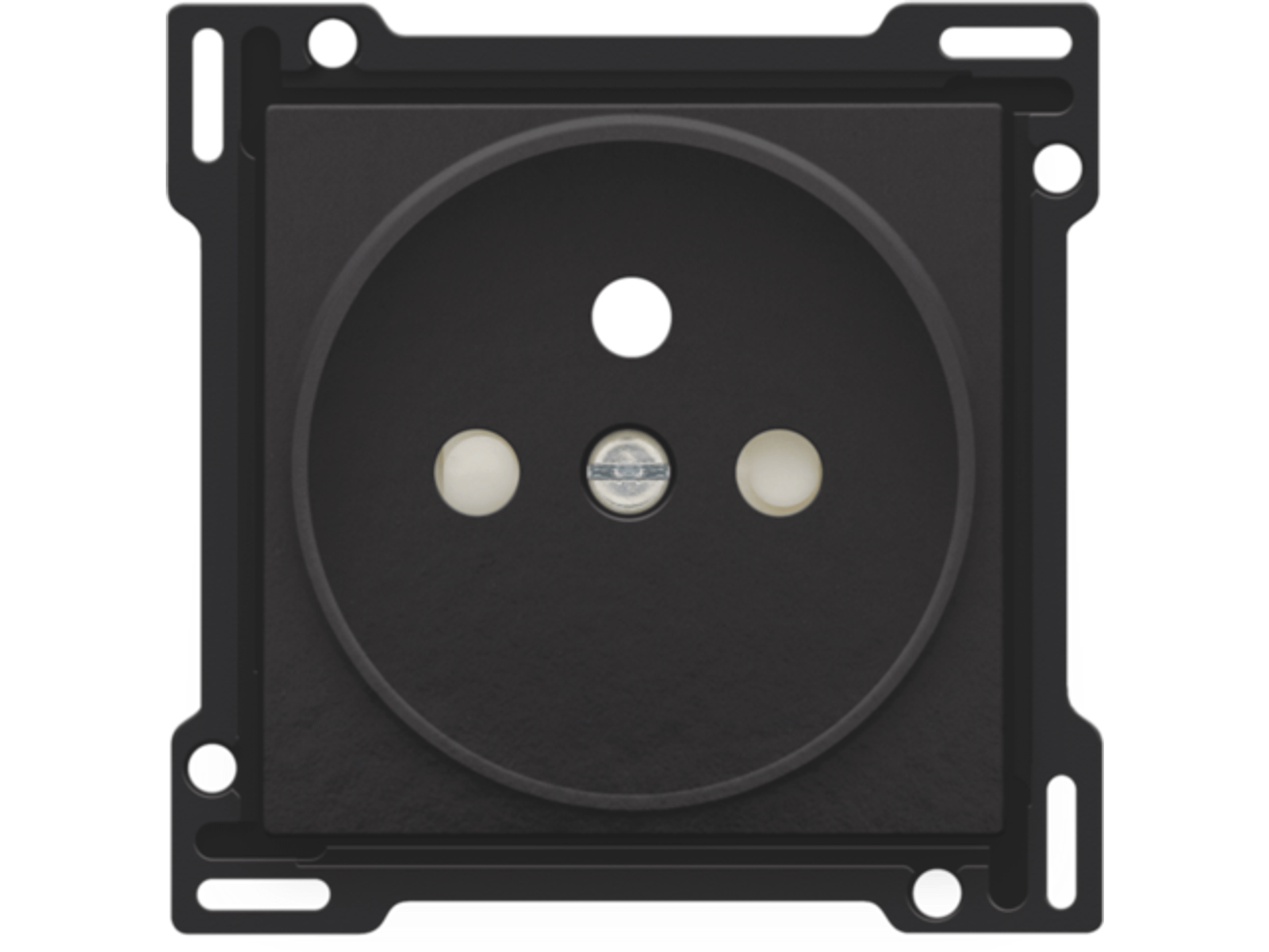 Centraalplaat voor inbouwstopcontact met penaarde en beschermingsafsluiters. Deze centraalplaat dient gebruikt te worden op een stopcontact met inbouwdiepte van 21mm. Afwerkingskleur: Bakelite® piano black coated.