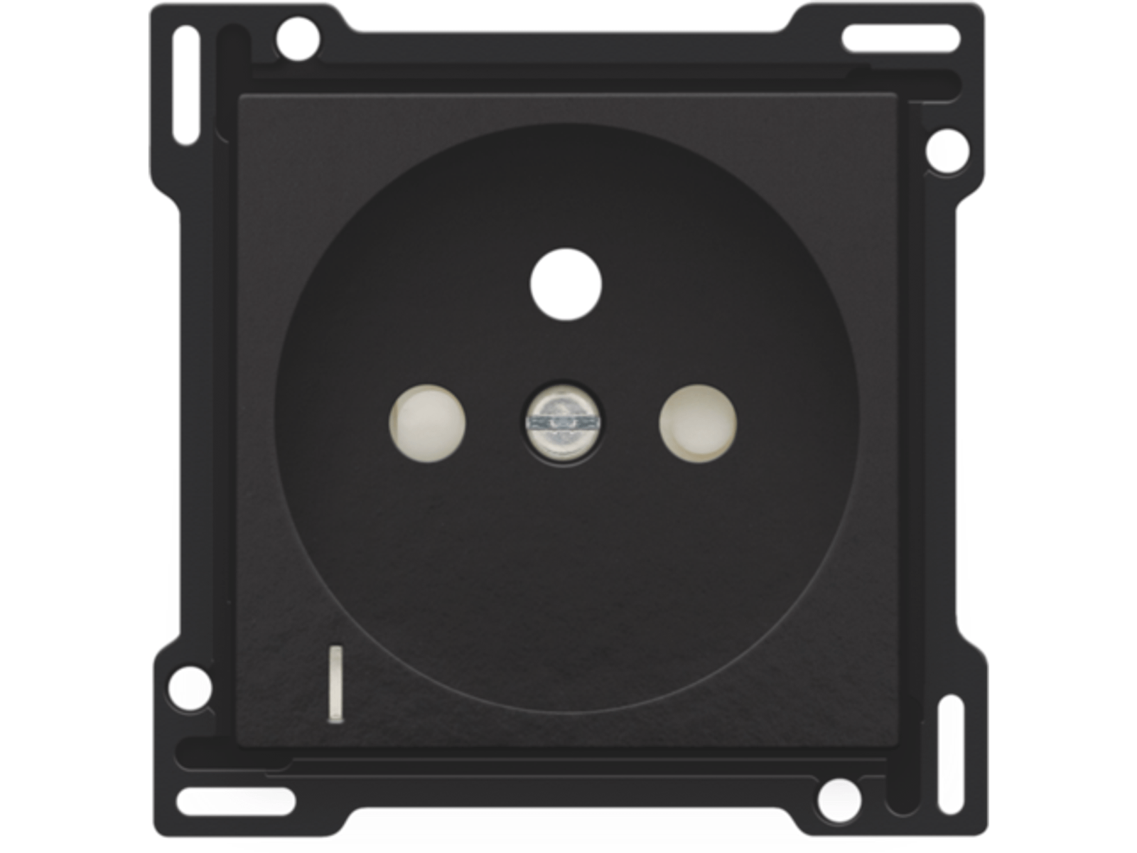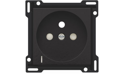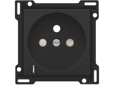 Centraalplaat voor inbouwstopcontact met penaarde, beschermingsafsluiters en klapdeksel. Deze centraalplaat dient gebruikt te worden op een stopcontact met spanningsaanduiding en met een inbouwdiepte van 28,5mm. Afwerkingskleur: Bakelite® piano black coated.