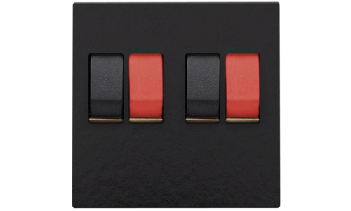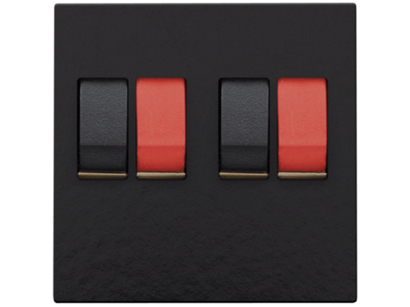 Centraalplaat met tweevoudige luidsprekeringangen. Afwerkingskleur: Bakelite® piano black coated.