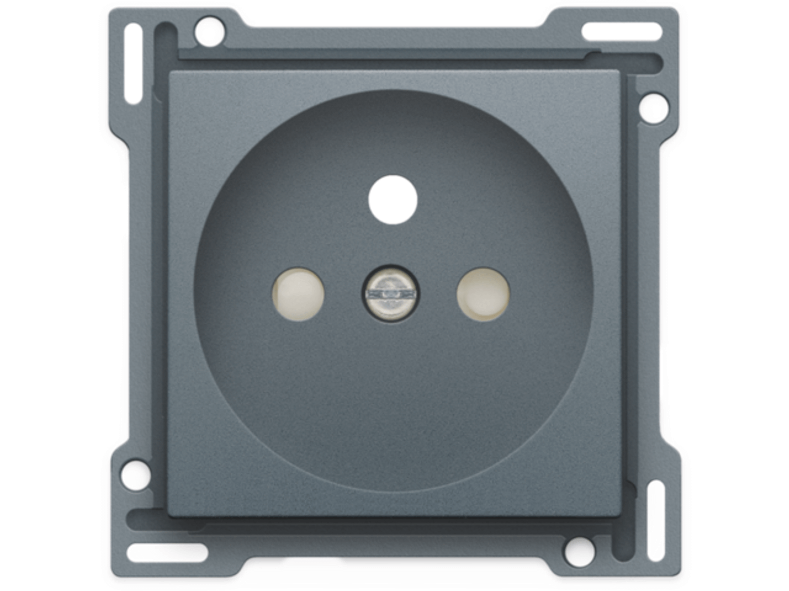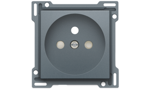 Centraalplaat voor inbouwstopcontact met penaarde en beschermingsafsluiters. Deze centraalplaat dient gebruikt te worden op een stopcontact met inbouwdiepte van 28,5mm. Afwerkingskleur: alu steel grey coated.
