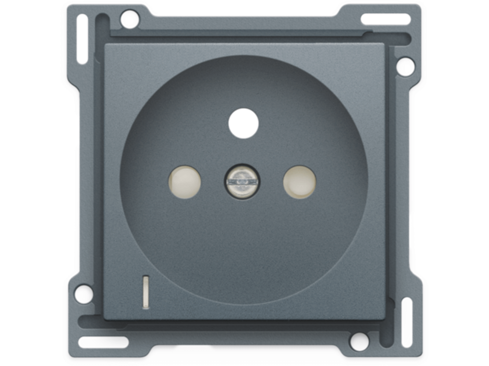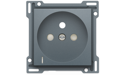 Centraalplaat voor inbouwstopcontact met penaarde, beschermingsafsluiters en klapdeksel. Deze centraalplaat dient gebruikt te worden op een stopcontact met spanningsaanduiding en met een inbouwdiepte van 28,5mm. Afwerkingskleur: alu steel grey coated.