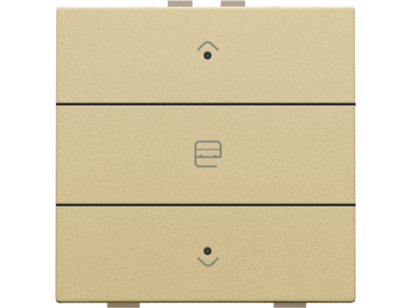 Met deze drukknop stuur je een groep van rolluiken, gordijnen of zonweringen. Hij wordt via een klikmechanisme op de muurprint bevestigd. Een led geeft aan in welke positie het rolluik, het gordijn of de zonwering zicht bevindt. Mechanisme inclusief toets. Afwerkingskleur: alu gold coated.