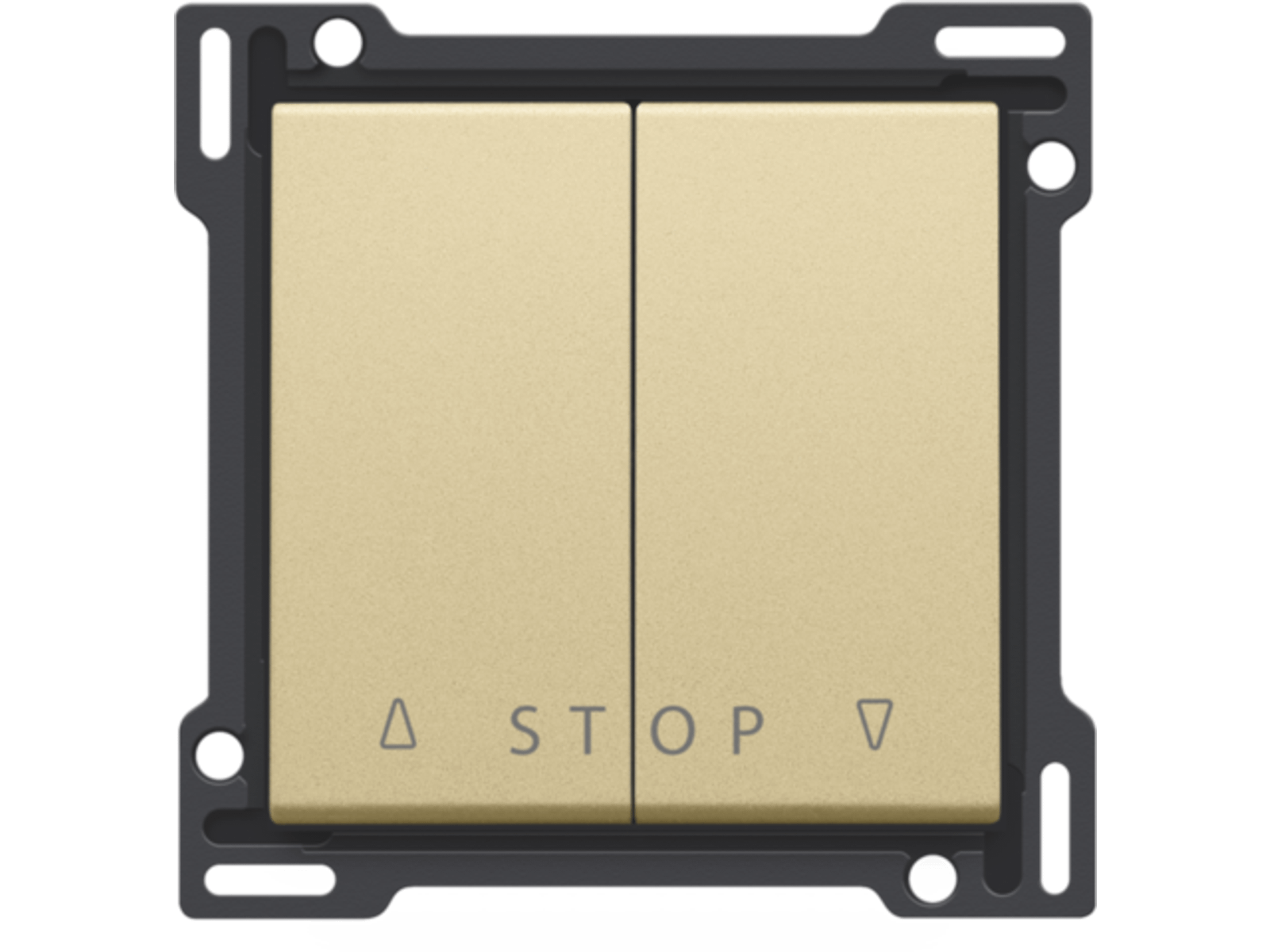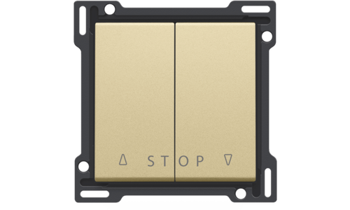 Centraalplaat met 2 toetsen voor electronische rolluiksturing via drukknop. De eerste toets heeft een 'omhoog' functie met stop. Met de tweede toets kan je de rolluiken of zonneweringen omlaag sturen met een stopfunctie. Afwerkingskleur: alu gold coated.