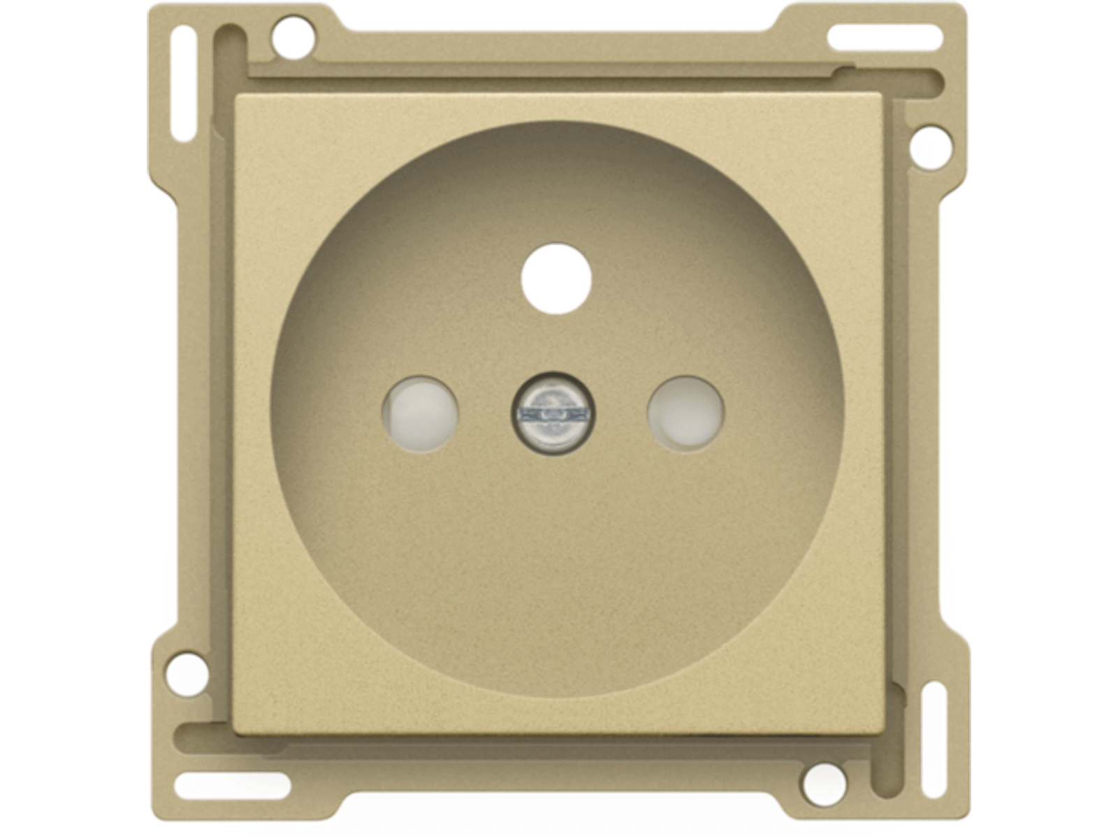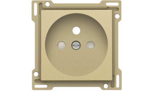 Centraalplaat voor inbouwstopcontact met penaarde en beschermingsafsluiters. Deze centraalplaat dient gebruikt te worden op een stopcontact met inbouwdiepte van 28,5mm. Afwerkingskleur: alu gold coated.