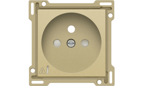 Centraalplaat voor inbouwstopcontact met penaarde, beschermingsafsluiters en klapdeksel. Deze centraalplaat dient gebruikt te worden op een stopcontact met overspanningsbeveiliging en met een inbouwdiepte van 28,5mm. Afwerkingskleur: alu gold coated.