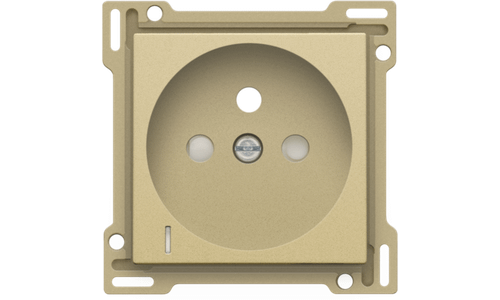 Centraalplaat voor inbouwstopcontact met penaarde, beschermingsafsluiters en klapdeksel. Deze centraalplaat dient gebruikt te worden op een stopcontact met spanningsaanduiding en met een inbouwdiepte van 28,5mm. Afwerkingskleur: alu gold coated.