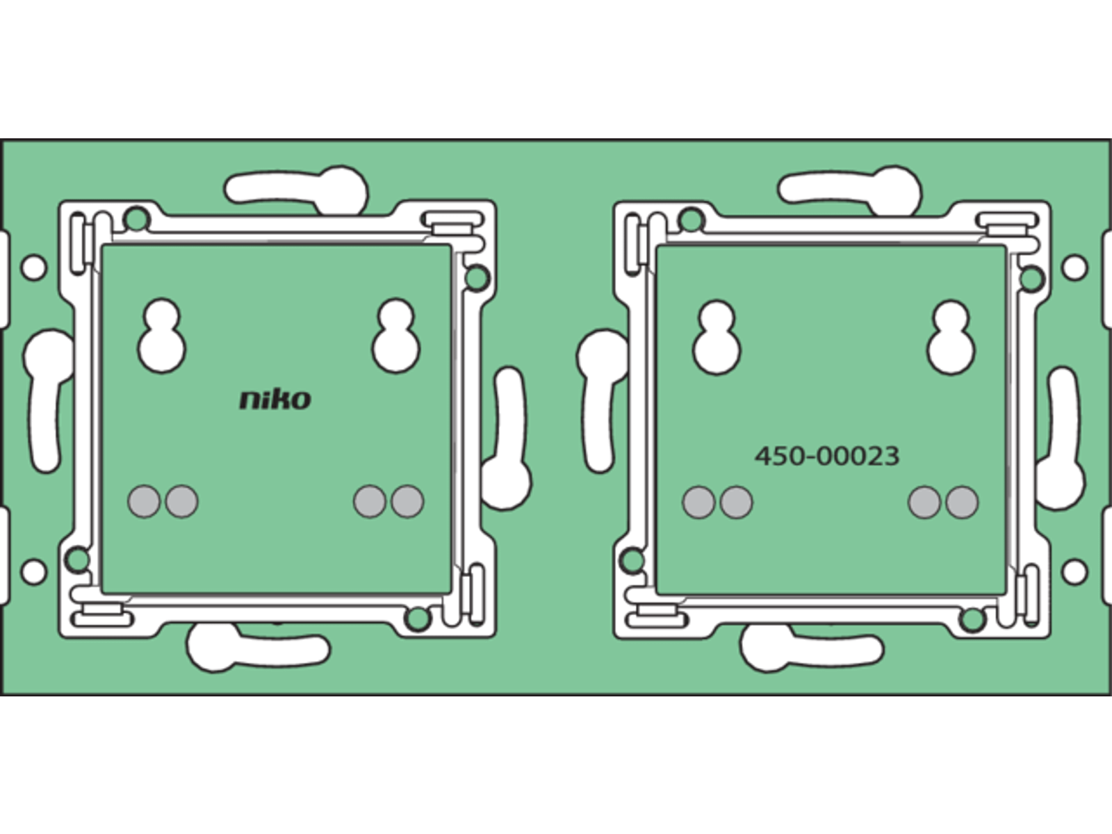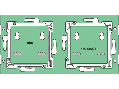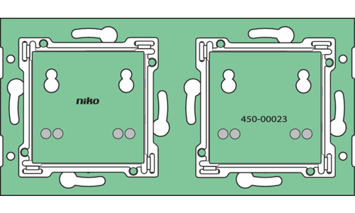 Met deze complete muurprint verbind je een of meerdere beldrukknoppen met de bus en stuur je signalen door. Je monteert hem op een enkelvoudige standaardinbouwdoos voor horizontale schroefbevestiging. Voor de bevestiging van meervoudige afdekplaten heb je geen bijkomende inbouwdozen nodig. De Nikobus-drukknoppen breid je eenvoudig vanuit de inbouwdoos in alle richtingen uit, zonder extra kap- of breekwerk. Bij de muurprint levert Niko je standaard een 4-polige aansluitconnector (2 voor Nikobus, 2 voor led- of infrarood-busdrukknopvoeding). Niko heeft ook een enkelvoudige muurprint met metalen brug. Die gebruik je op oneffen muren of in combinatie met andere metalen bruggen, zoals bij een stopcontact, thermostaat of klassieke schakelaar. Een set klauwen voor dozen zonder schroefbevestiging bestel je afzonderlijk. De connector is 4-polig (8-polig bij 05-012-50). Je monteert de busdrukknop met 1 centrale schroef. De muurprint bevestig je aan de muur met schroeven of klauwen.