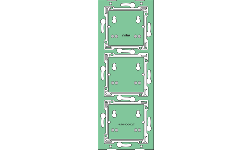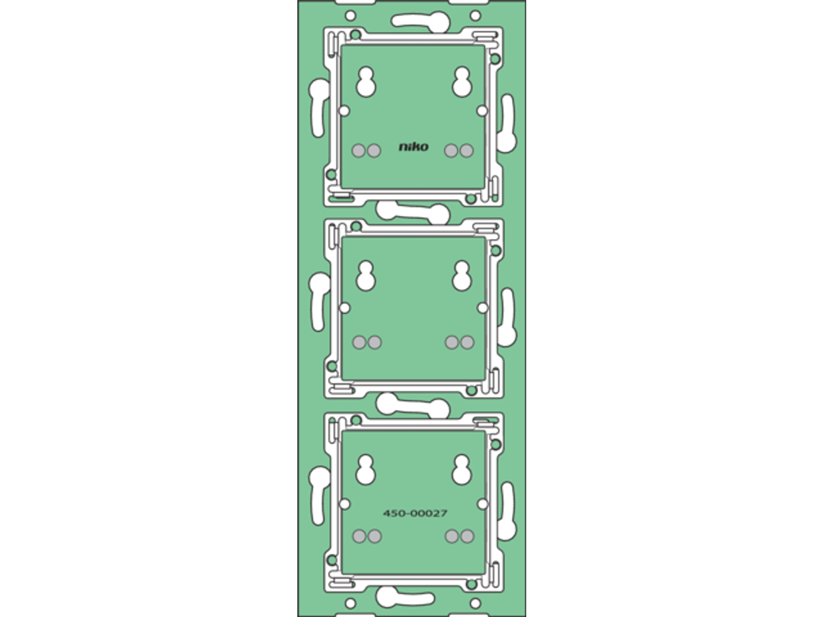 Met deze complete muurprint verbind je een of meerdere beldrukknoppen met de bus en stuur je signalen door. Je monteert hem op een enkelvoudige standaardinbouwdoos voor horizontale schroefbevestiging. Voor de bevestiging van meervoudige afdekplaten heb je geen bijkomende inbouwdozen nodig. De Nikobus-drukknoppen breid je eenvoudig vanuit de inbouwdoos in alle richtingen uit, zonder extra kap- of breekwerk. Bij de muurprint levert Niko je standaard een 4-polige aansluitconnector (2 voor Nikobus, 2 voor led- of infrarood-busdrukknopvoeding). Niko heeft ook een enkelvoudige muurprint met metalen brug. Die gebruik je op oneffen muren of in combinatie met andere metalen bruggen, zoals bij een stopcontact, thermostaat of klassieke schakelaar. Een set klauwen voor dozen zonder schroefbevestiging bestel je afzonderlijk. De connector is 4-polig (8-polig bij 05-012-50). Je monteert de busdrukknop met 1 centrale schroef. De muurprint bevestig je aan de muur met schroeven of klauwen.