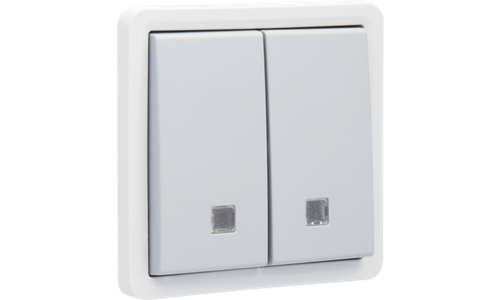 Deze verlichtbare dubbele opbouwdrukknop is voorzien van twee toetsen en twee maak (N.O.)- of verbreekcontacten (N.G.). Hij wordt in een spuitwaterdichte opbouwdoos geplaatst. Onderaan het mechanisme bevinden zich twee nissen voor integratie van twee verlichtingseenheden met draden. Het geheel is spuitwaterdicht wat het uitermate geschikt maakt voor gebruik in vochtige ruimtes en veeleisende omgevingen. De verlichtingseenheden moeten afzonderlijk besteld worden. Kleurcombinatie: lichtgrijs met donkergrijze toets.