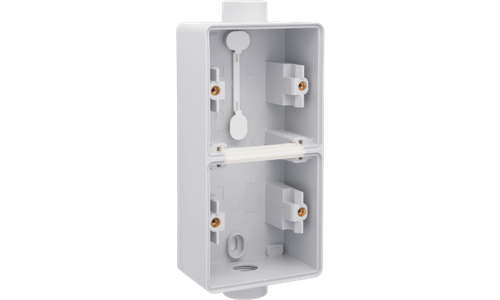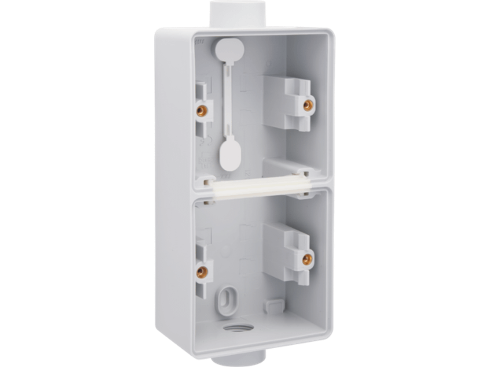 Deze dubbele verticale opbouwdoos met twee enkelvoudige M20-ingangen is geschikt voor het inbouwen van twee functies. Het geheel is spuitwaterdicht wat het uitermate geschikt maakt voor gebruik in vochtige ruimtes en veeleisende omgevingen. Afwerkingskleur: grey