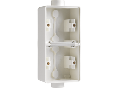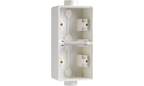 Deze dubbele verticale opbouwdoos met twee enkelvoudige M20-ingangen is geschikt voor het inbouwen van twee functies. Het geheel is spuitwaterdicht wat het uitermate geschikt maakt voor gebruik in vochtige ruimtes en veeleisende omgevingen. Afwerkingskleur: white
