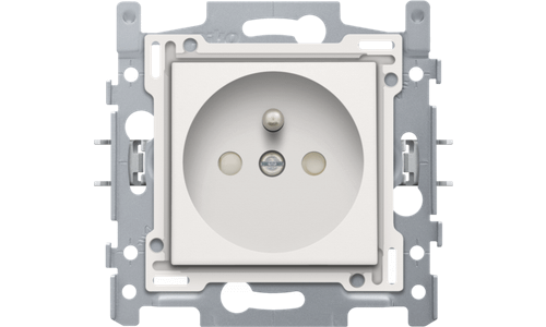 Samengestelde wandcontactdoos met penaarde (sokkel en afwerkingsset). De sokkel is uitgerust met insteekklemmen en klauwbevestiging. Het stopcontact heeft ook een beschermingsafsluiters en heeft een inbouwdiepte van 28,5 mm. Afwerkingskleur: white
