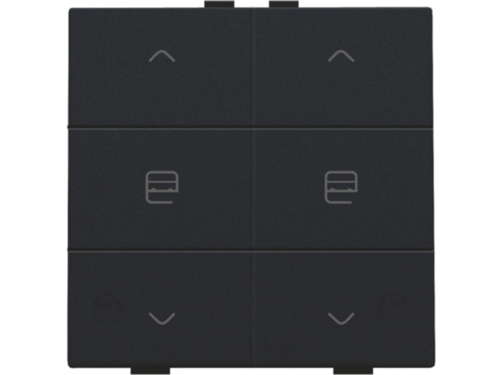 Met deze drukknop stuur je twee groepen van rolluiken, gordijnen of zonweringen. Hij wordt via een klikmechanisme op de muurprint bevestigd. Mechanisme inclusief toets. Afwerkingskleur: black coated.