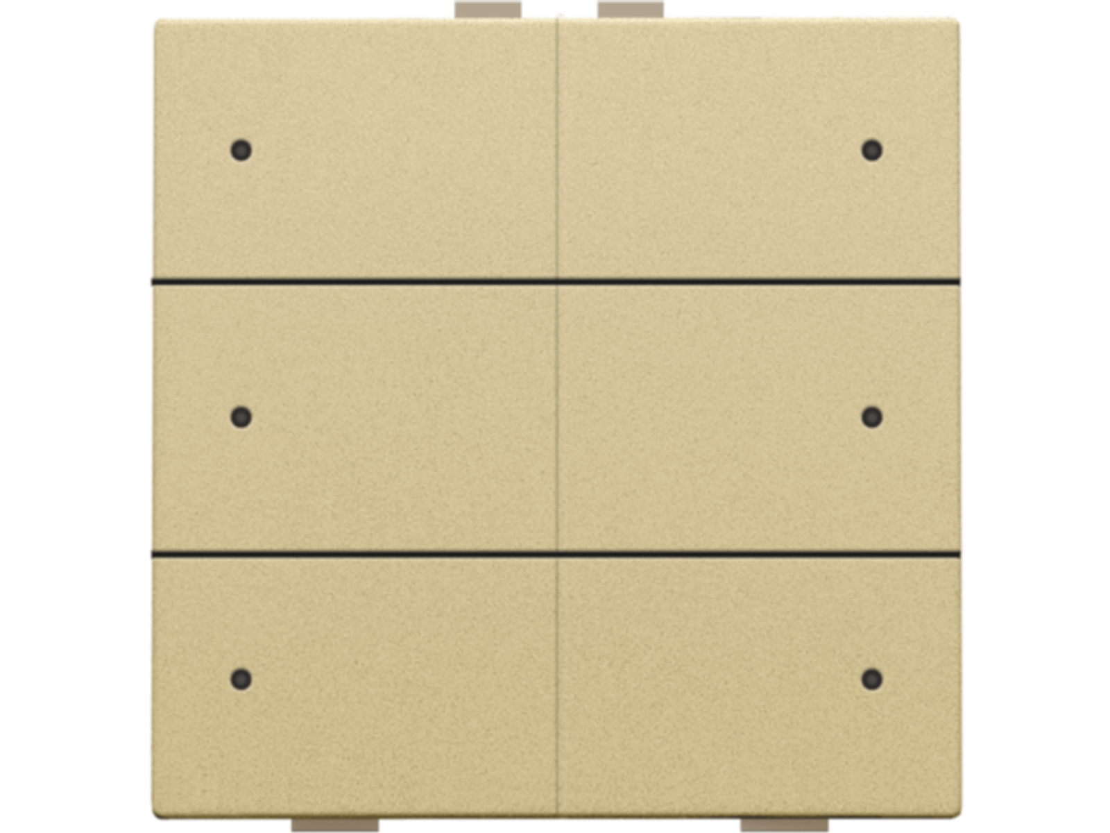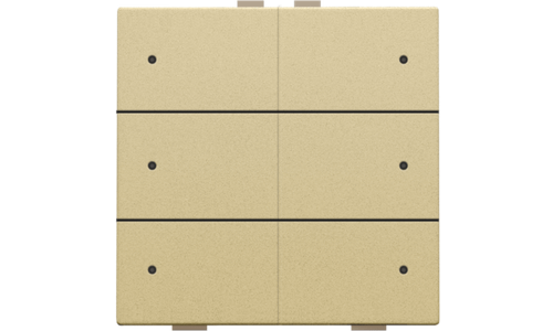 Met deze drukknop voer je zes bedieningen uit. Hij wordt via een klikmechanisme op de muurprint bevestigd. Een led geeft aan of het licht aan- of uitgeschakeld is. Mechanisme inclusief toets. Afwerkingskleur: alu gold coated.