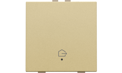 Met deze drukknop met het symbool "woning verlaten" voer je één bediening uit. Met deze knop kan de bewoner alle lichtpunten in zijn huis uitschakelen, evenals bepaalde toestellen die een veiligheidsrisico kunnen vormen (strijkijzer, kookplaat, frietketel). Je bepaalt in de programmeersoftware eenvoudig welke lichtpunten/toestellen uitgeschakeld worden. Hij wordt via een klikmechanisme op de muurprint bevestigd. Een led geeft aan of het licht aan- of uitgeschakeld is. Mechanisme inclusief toets. Afwerkingskleur: alu gold coated.