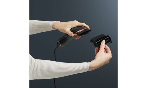 - Met het Coanda-effect wordt de luchtstroom omgeleid om het haar in de gladmakende kam te trekken, voor gladde resultaten zonder kroezen.